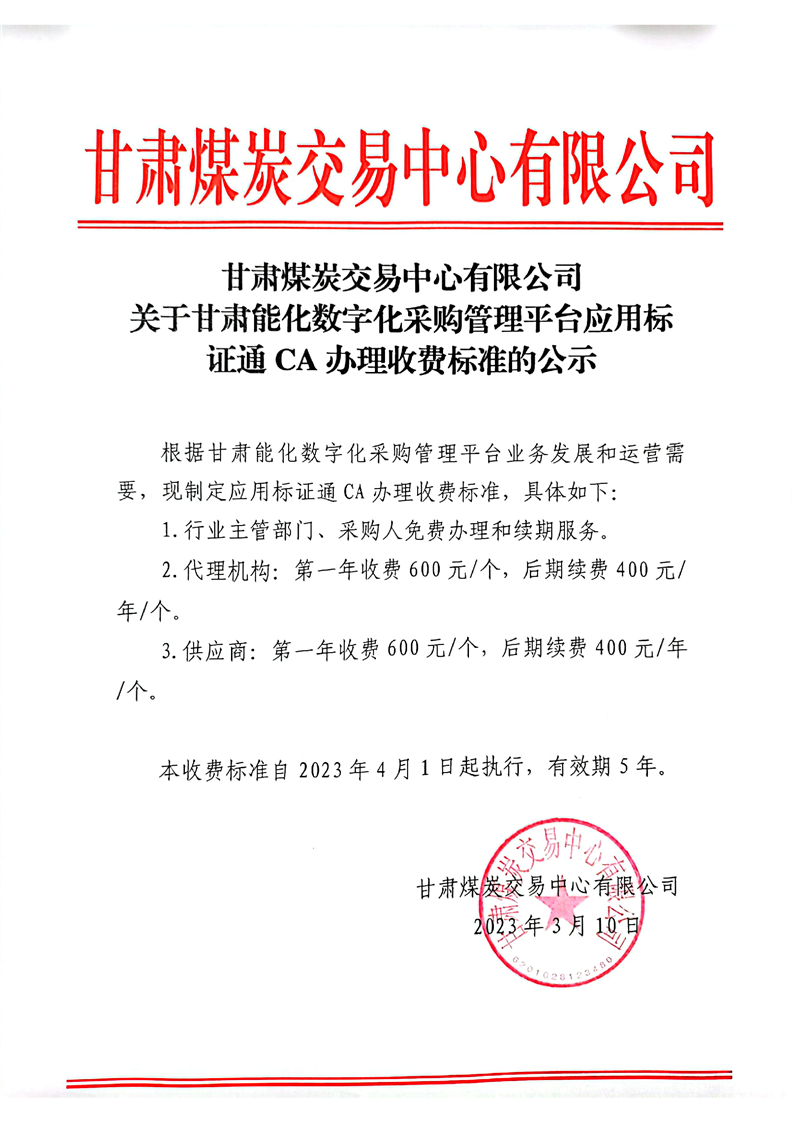關(guān)于甘肅能化數(shù)字化采購管理平臺應(yīng)用標(biāo)證通CA辦理收費(fèi)標(biāo)準(zhǔn)的公示